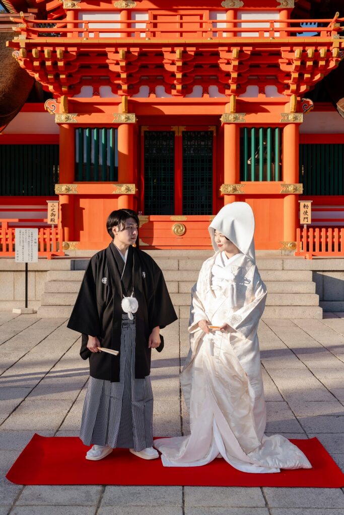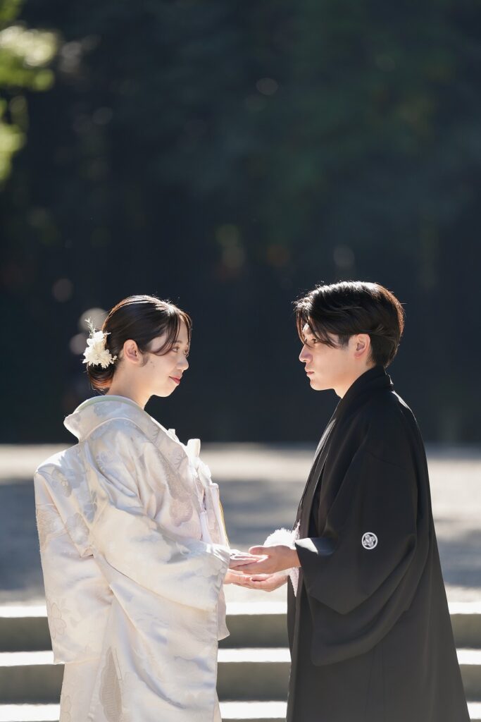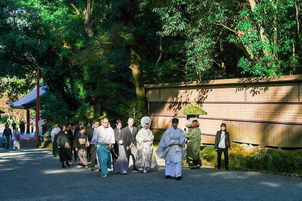 挙式の準備が整い、手水で清めてから上宮の結婚式場まで参進します。宇佐神宮では、控室から挙式会場までゆっくり10分ほど歩きます。途中、すれ違う方々から「おめでとうございます」と声をかけていただくこともあり、嬉しい時間です。少し休憩をはさみ、厳かな神前式へ。静かに交わされるおふたりの誓いと、ご家族のあたたかな表情がとても印象的な結婚式でした。