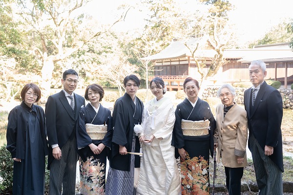 挙式のあとは別府へ移動し、神和苑でご親族とのお食事会を行いました。披露宴ではなく、挙式を中心にご家族へお披露目する、シンプルな一日。ゆっくりお食事をしながら過ごす時間は、ご両親やおじいちゃん、おばあちゃんにとっても大切なひとときだったと思います。そのままご宿泊され、ご家族で過ごす特別な時間となりました。
