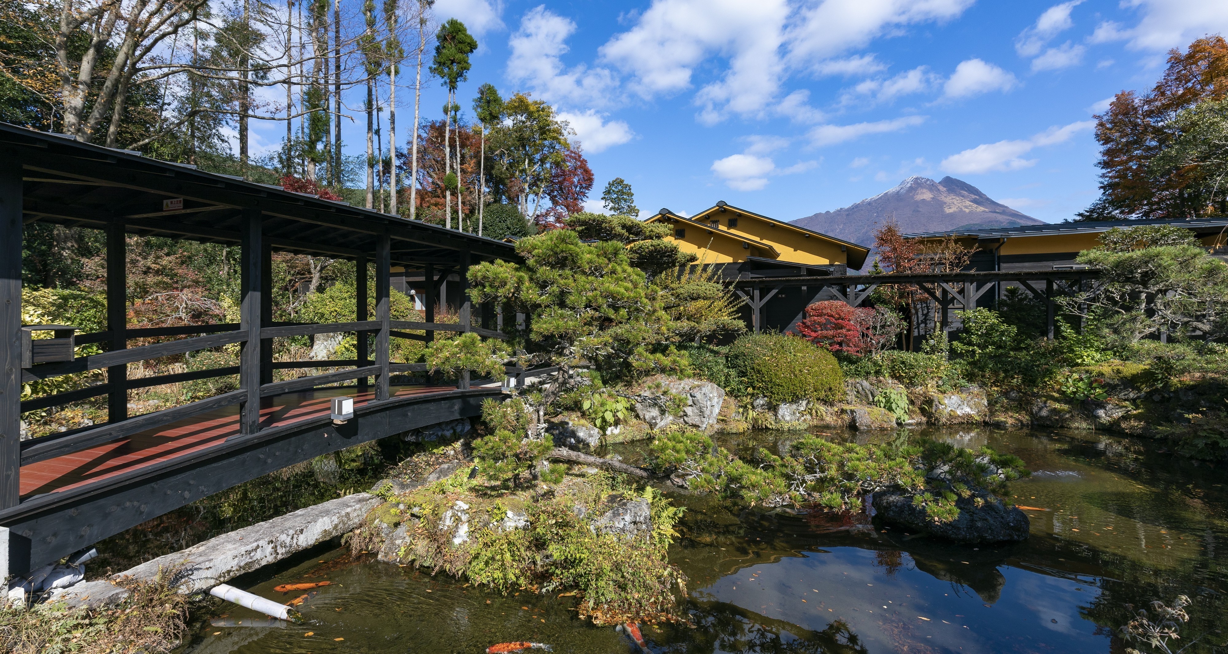 - 木々と池に囲まれた敷地内で由布岳をバックに撮影できます